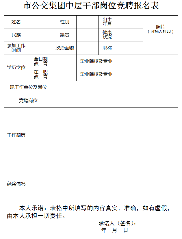 2.報(bào)名方式為現(xiàn)場、網(wǎng)上兩種方式。可登陸荊門市公共交通集團(tuán)有限公司網(wǎng)站,下載《市公交集團(tuán)中層干部崗位競聘報(bào)名表》并填寫,